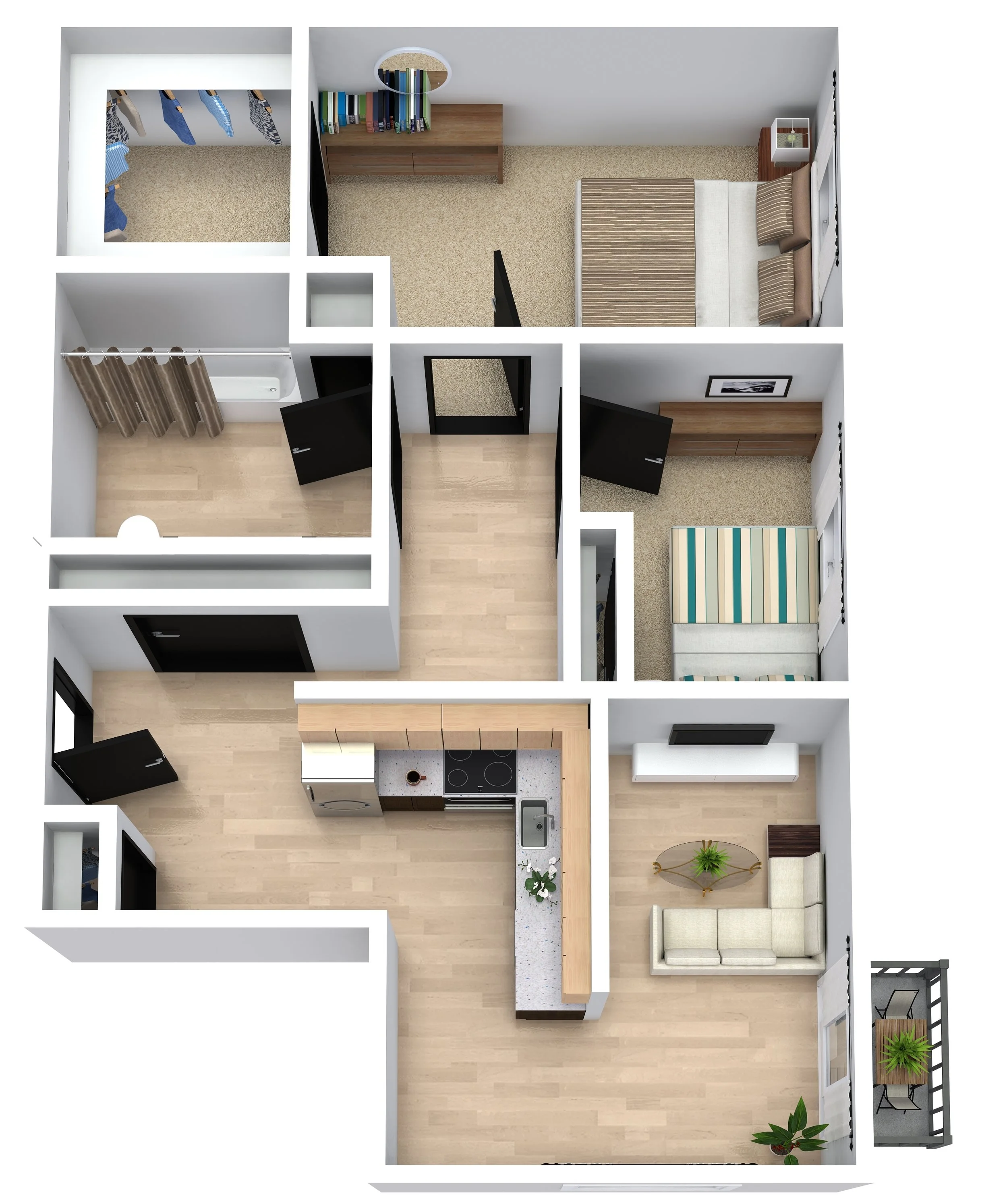 Our one-bedroom apartments feature quartz countertops, stainless steel appliances, luxury vinyl plank flooring, and open-concept layouts with abundant natural light. Balconies or patios are included in every unit, creating a bright, inviting space perfect for professionals or anyone seeking modern living along the Mississippi River.
