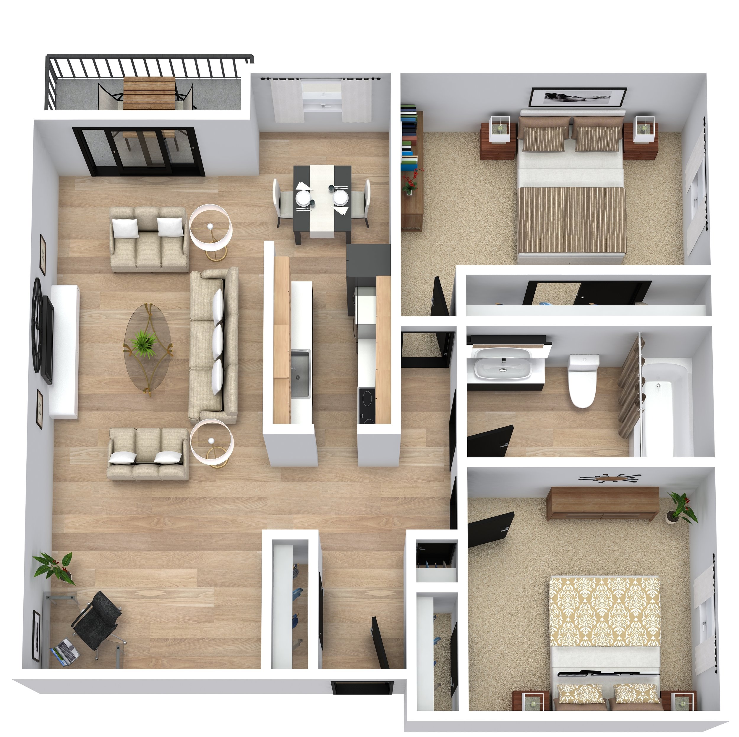 Our two-bedroom, two-bath apartments combine spacious interiors with dual bathrooms, quartz countertops, stainless steel appliances, luxury vinyl plank flooring, and open-concept layouts. Every unit includes a balcony or patio, and select units feature stunning river views, and thoughtful design for both style and convenience.